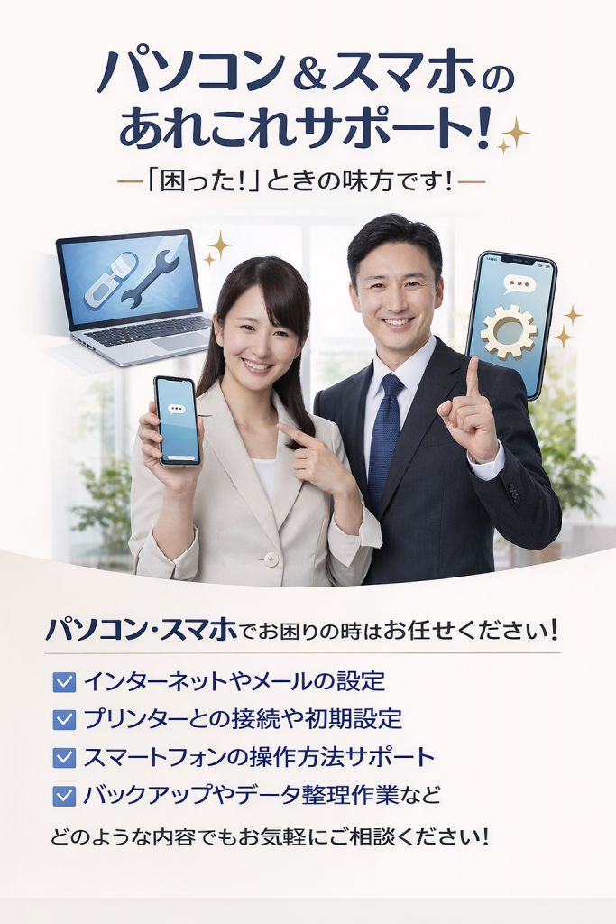 お電話、メールでのサポートや、パソコンの遠隔操作によるサポートも行っております。